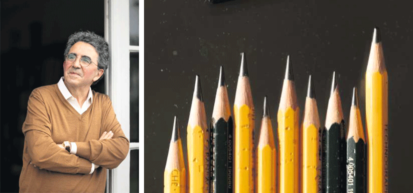 Den Raum beherrscht ein langer Glastisch. Darauf liegen unter anderem Entwürfe für die Brücke, die dereinst in Eglisau den Rhein überspannen wird. Die Detailskizzen einzelner Brückenbestandteile zeigen: Calatrava justiert unermüdlich bei seinen Projekten. Verschiedene Bleistifte – von denen einige nur noch Stummel sind – liegen neben einem kleinen Aquarellmalkasten. Die Farben darin sind noch nass, der Architekt hat ein paar Farbkleckse an den Händen.