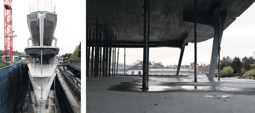 Mitte November steht die Montage der Fassade an. Die zu Gruppen zusammengefassten und vorgefertigten Fassadenelemente werden dann an ihren Platz gehängt. Die Halterungen an den Etagenböden sind bereits zu sehen. Sie seien hierfür in ihrer Position genau eingemessen worden, sagen die zuständigen Ingenieure.